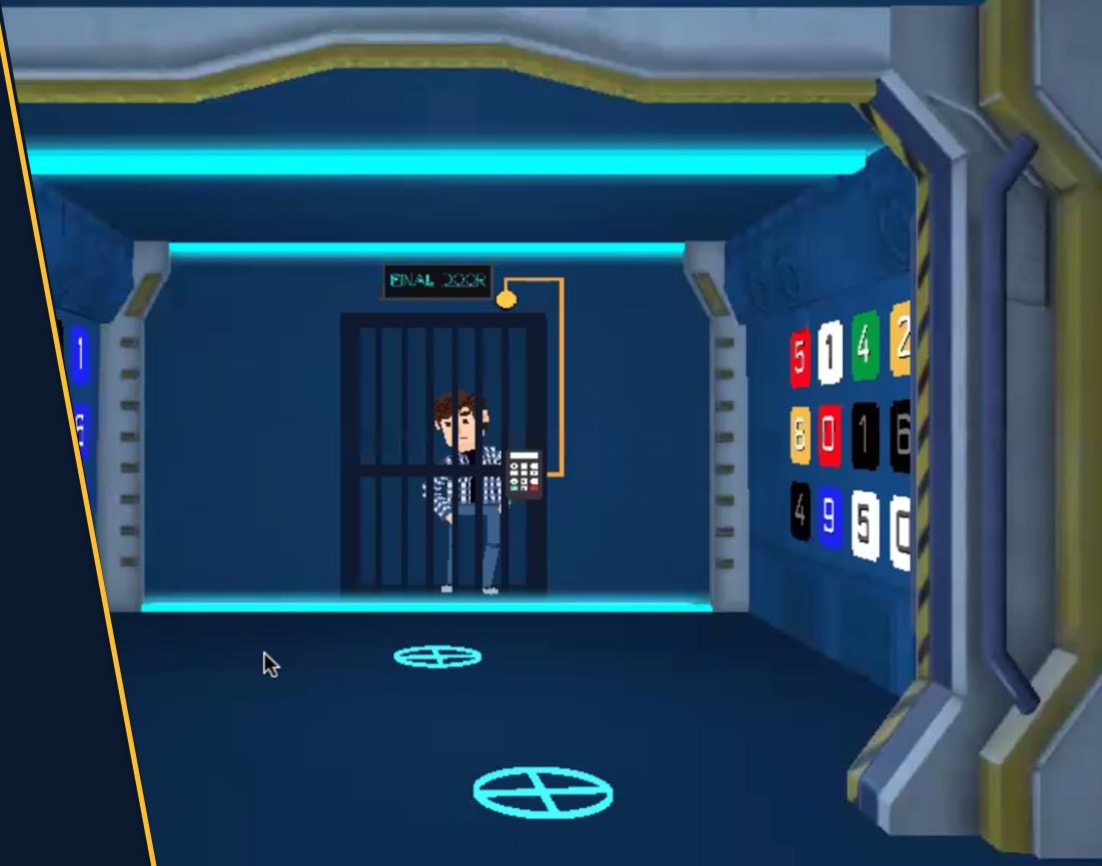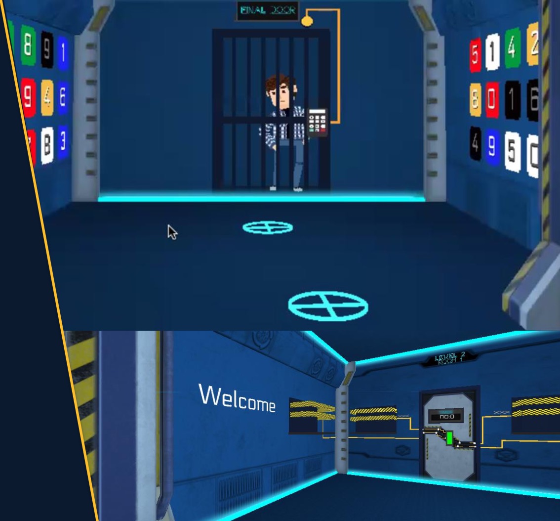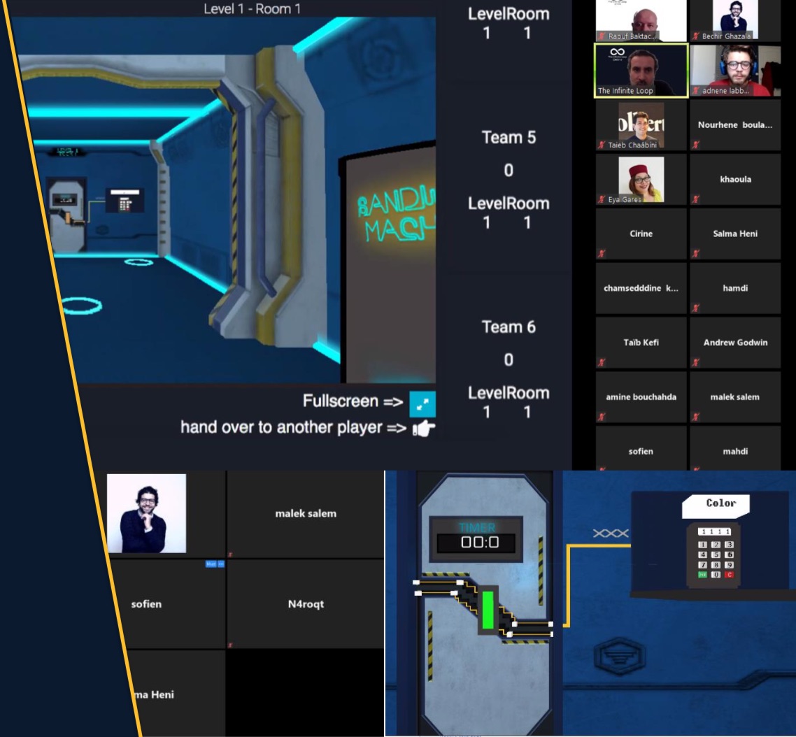 The team must pass through a series of doors that are locked with a puzzle. Each team collaborates in a breakout group on zoom (or any video conferenceing app). For each door, one team member can see the spaceship. He is the explorer ! The others, the guides, have information to help them unlock the door.